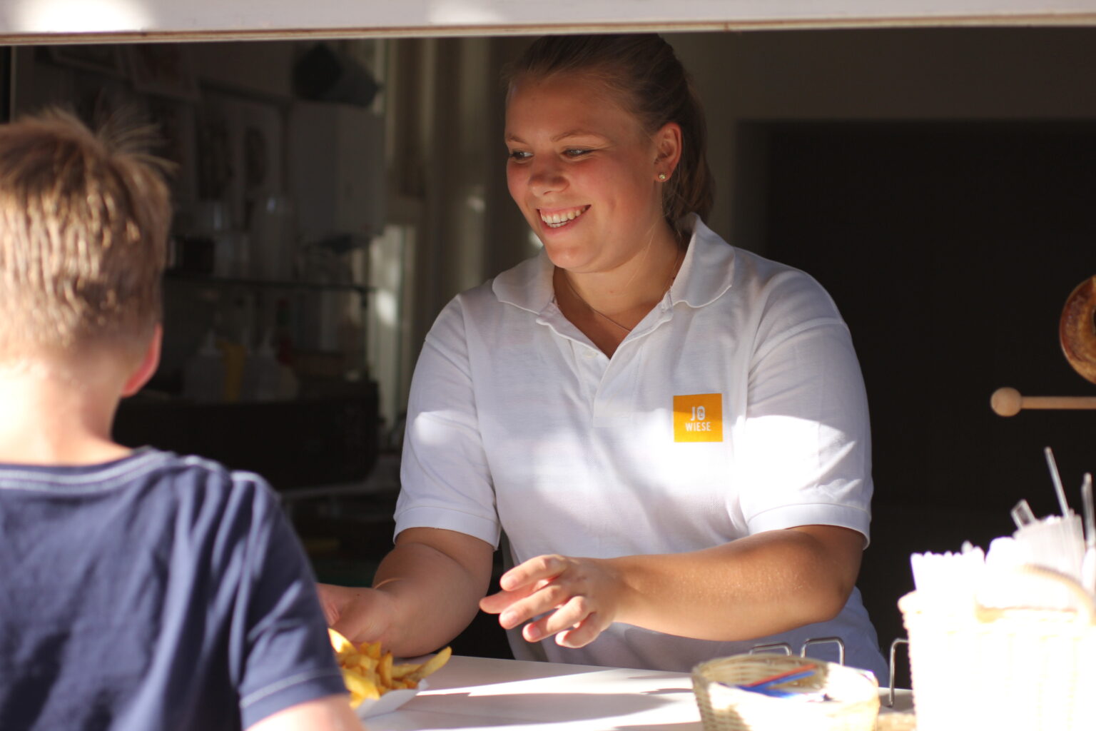 In unserer WiesenInfo unseres Freibads JoWiese: Empfang unserer Badegäste und Besuchender unserer WiesenTerrasse, Einlasskontrolle, Bestell- und Kassentätigkeiten